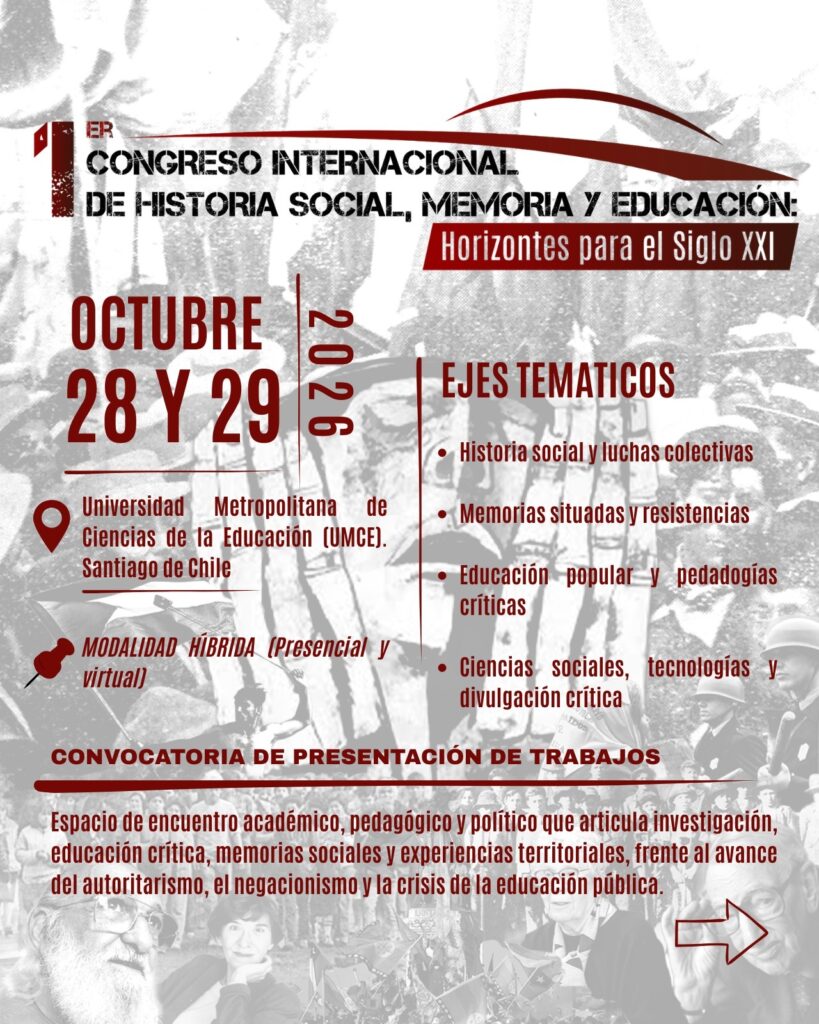La Universidad Metropolitana de Ciencias de la Educación (UMCE) realizará el 1° Congreso Internacional de Historia Social, Memoria y Educación: Horizontes para el Siglo XXI, una iniciativa organizada por egresadas y egresados del Departamento de Historia y Geografía, que busca fortalecer el diálogo intergeneracional y proyectar el pensamiento crítico latinoamericano en el escenario contemporáneo.