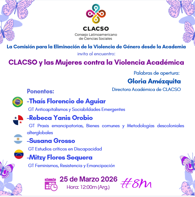 La apertura estará a cargo de Gloria Amézquita, Directora Académica de CLACSO. Participarán como expositoras Thais Florencio de Aguiar, Rebeca Yanis Orobio, Susana Grosso y Mitzy Flores Sequera, integrantes de distintos Grupos de Trabajo de CLACSO.