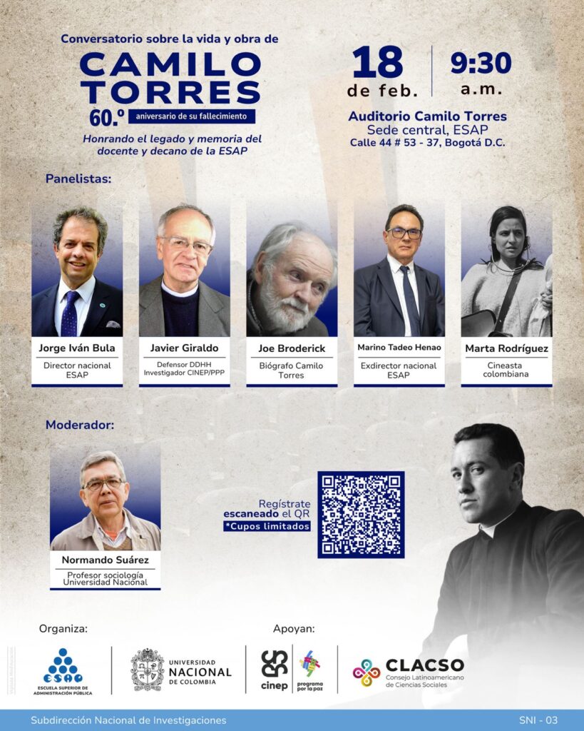 En el marco del 60.º aniversario de su fallecimiento, invitamos a participar de este espacio de diálogo para reflexionar sobre el legado de Camilo Torres, su compromiso con el pueblo colombiano y su deseo de transformación social.