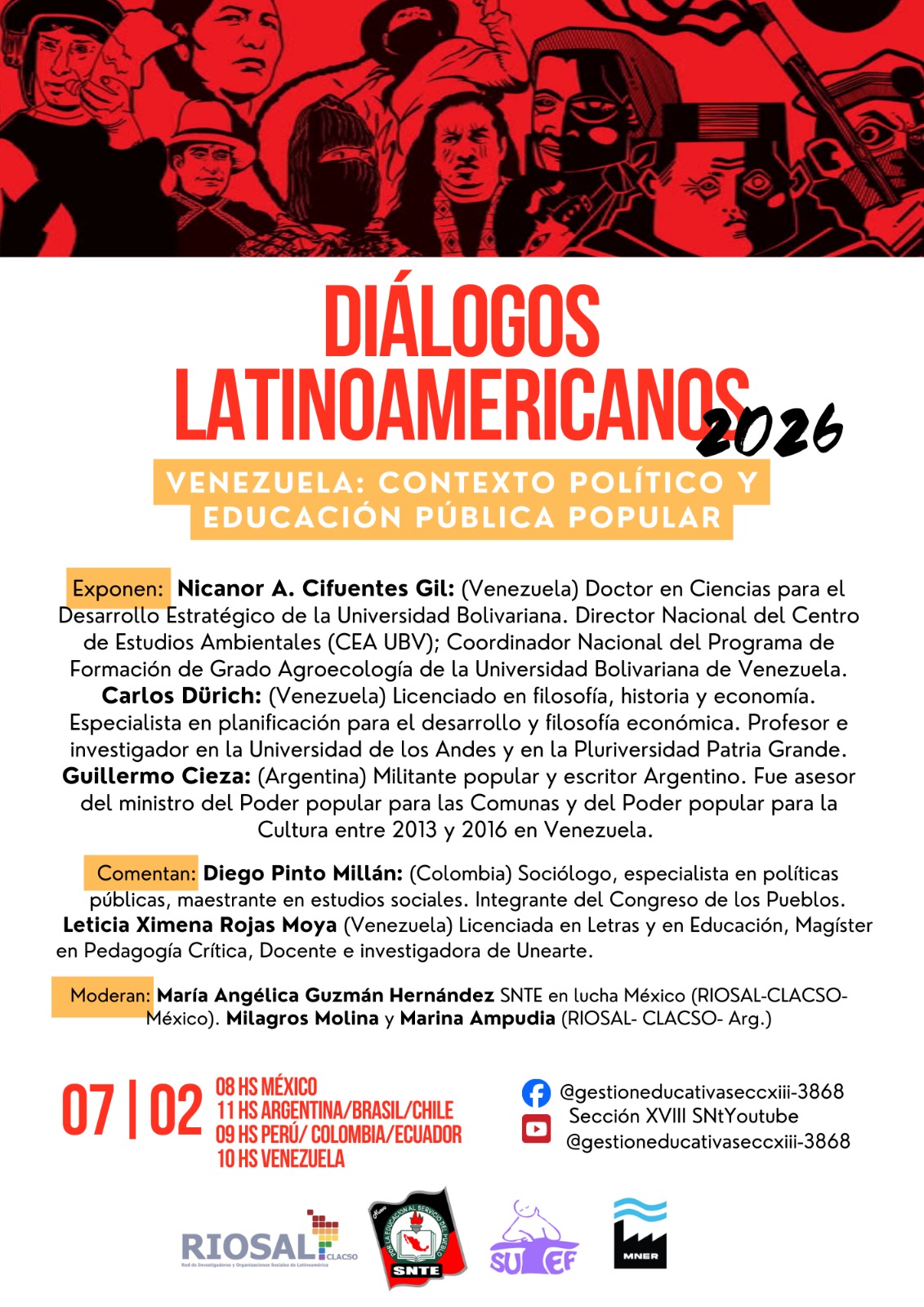 Diálogos Latinoamericanos es un espacio de encuentro virtual generado por la Red de Investigadores y Organizaciones Sociales de Latinoamérica (RIOSAL) para compartir y debatir sobre las situaciones coyunturales que atraviesan los países latinoamericanos, en general, y y sobre aspectos vinculados a la educación pública y popular, en particular. Para esta nueva edición (la primera del 2026) nos proponemos reflexionar sobre el ataque estadounidense a Venezuela, los escenarios en disputa y los desafíos que enfrenta la región ante esta ofensiva imperial con el aporte de destacados/as investigadores/as.