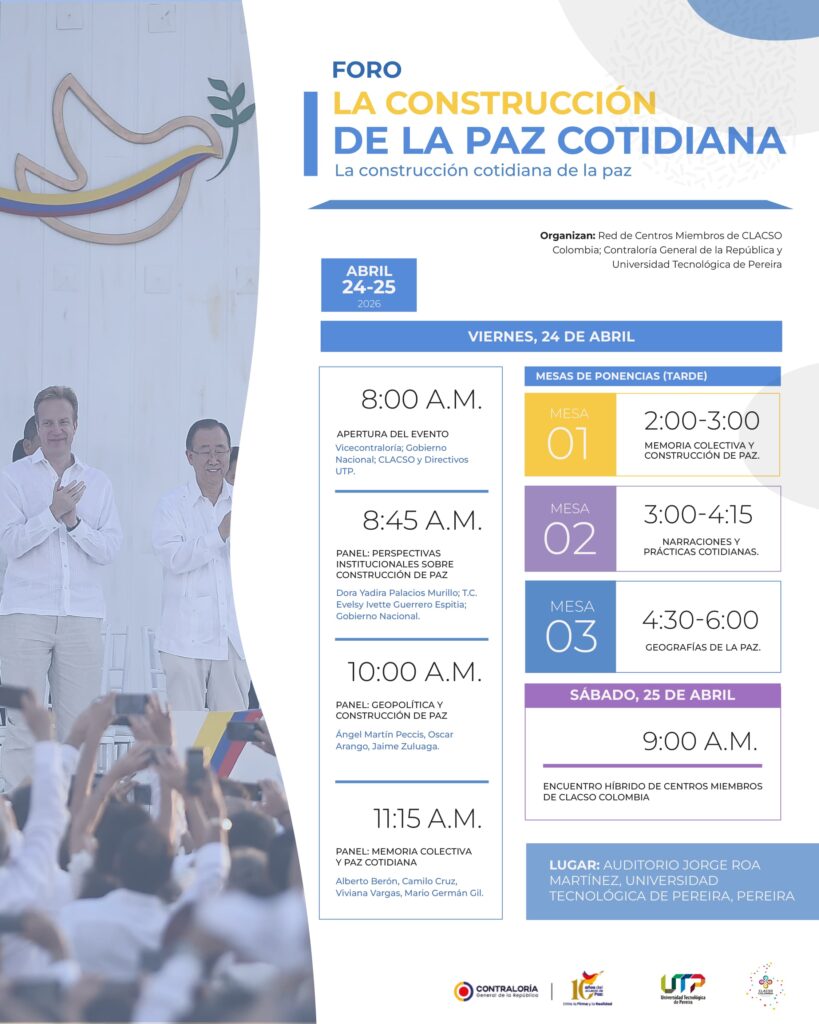 La Contraloría General de la República, realizará entre el 14 y el 18 de julio de 2026, el congreso “10 años del acuerdo de paz entre la firma y la realidad”. Para dicho evento la Contraloría ha convocado a la red de Centros miembros de CLACSO Colombia para la realización tanto de actividades en el marco del congreso como de un foro de preparación en el que se espera contar con la participación de académicos y académicas pertenecientes a la red de CLACSO.
