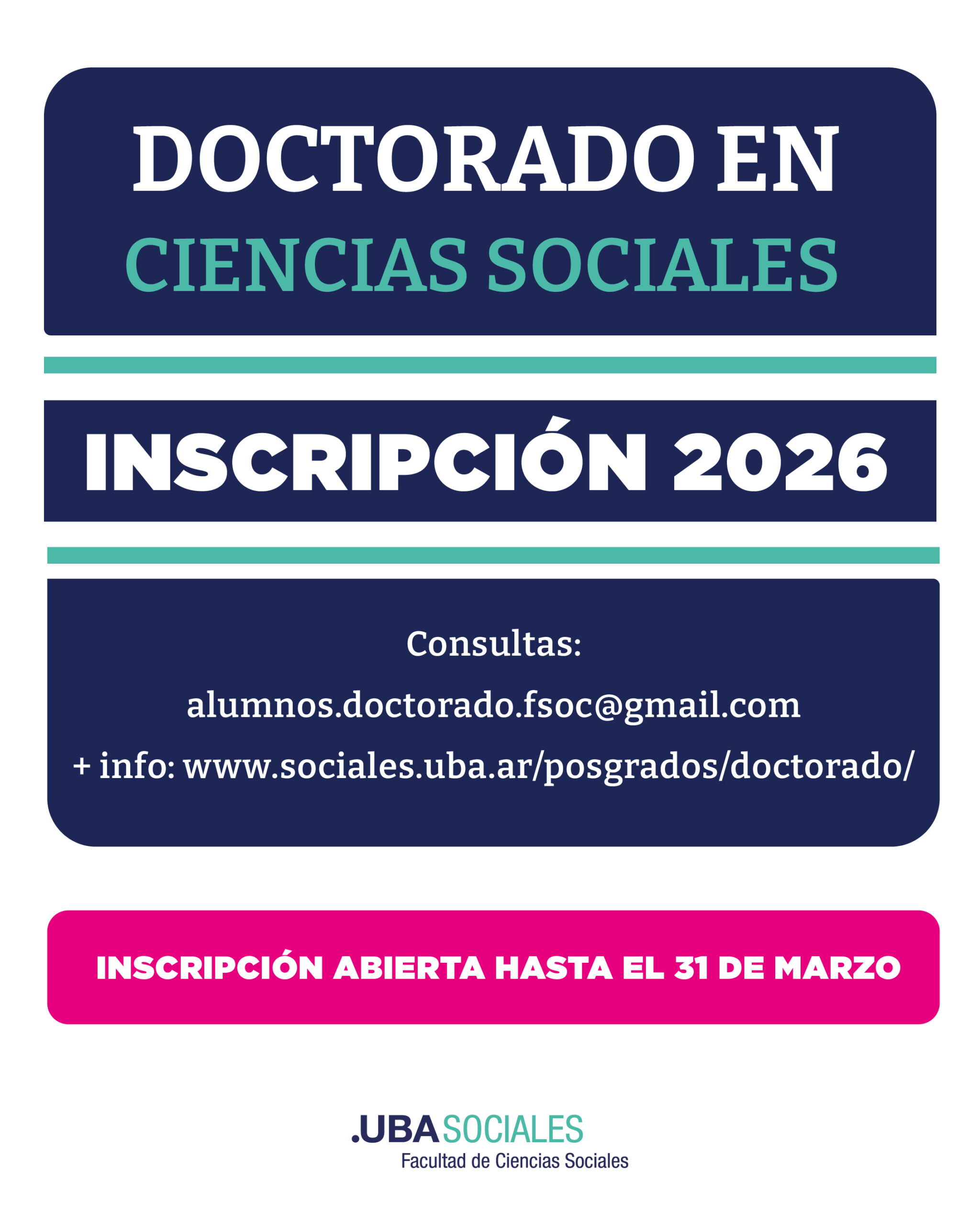 Se encuentra abierta la inscripción 2026 al Doctorado en Ciencias Sociales de la Facultad de Ciencias Sociales (UBA) Cierre de inscripción: 31 de marzo de 2026 Consultas:[email protected] Más información:www.sociales.uba.ar/posgrados/doctorado/