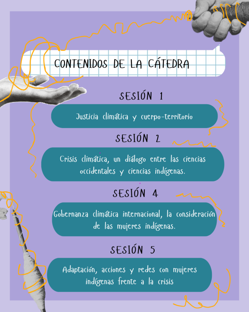 Esta cátedra integra conceptos de las ciencias ambientales modernas y los conocimientos indígenas para la comprensión de la crisis climática. Con el fin de promover el diálogo de conocimientos y posicionar los saberes indígenas como ciencia válida para entender y responder al cambio climático.