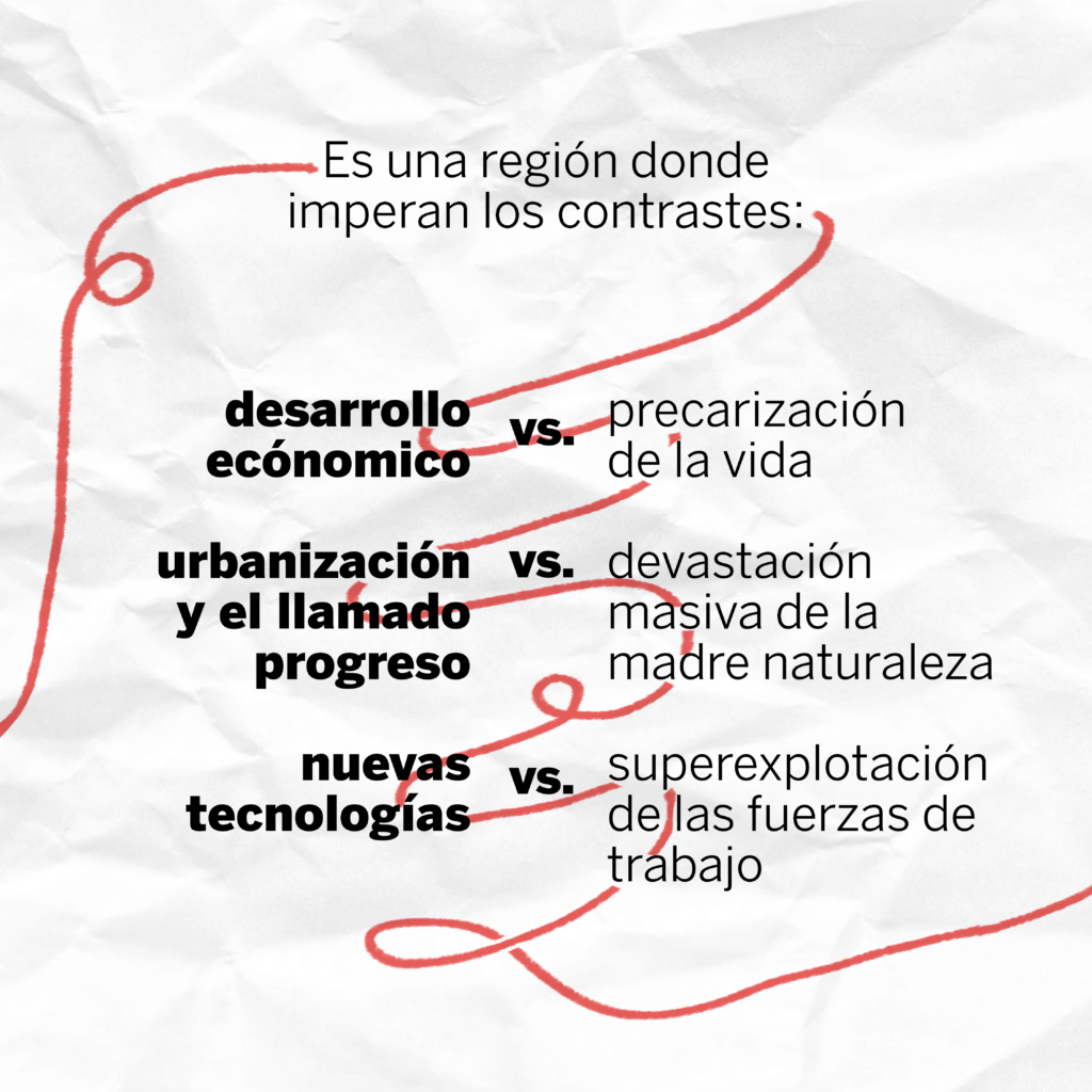 Este territorio es escenario de profundas contradicciones y desigualdades. Aquí las dinámicas del desarrollo económico y las nuevas tecnologías contrastan con la pobreza, la superexplotación de la fuerza de trabajo y la destrucción de la naturaleza. El rol de la industria criminal, la violencia y el desplazamiento forzado se ha convertido ya en parte de la normalidad. Sin embargo, también los pueblos resisten el embate a través de distintas formas de movilización, comunidad y organización. Reflexionamos sobre este territorio a partir de las dinámicas de conflicto transfronterizas que lo atraviesan.