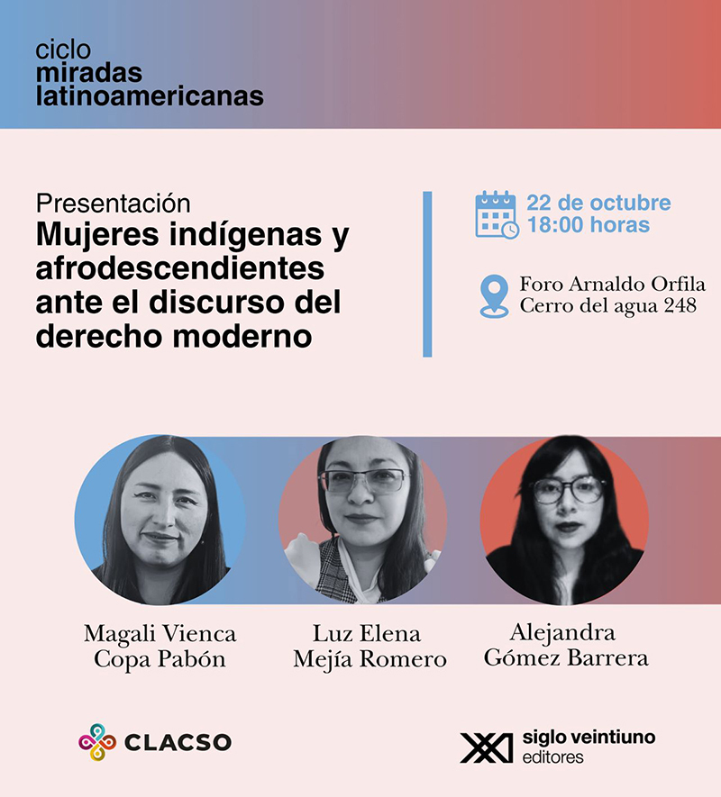 Presentación de “Mujeres indígenas y afrodescendientes ante el discurso del derecho moderno”. Con: Magali Vienca Copa Pabón, Luz Elena Mejía Romero y Alejandra Gómez Barrera