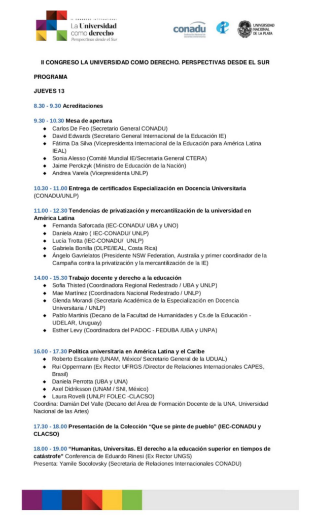 CONADU, IEAL y la UNLP organizan II Congreso internacional: La Universidad como derecho. Perspectivas desde el Sur. Se propone como una nueva oportunidad para compartir debates sobre la universidad en clave latinoamericana, popular, democrática y feminista.