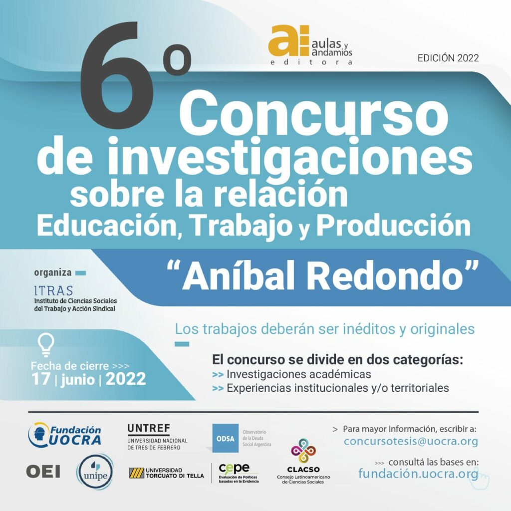 La Fundación UOCRA y su sello editorial, Aulas y Andamios, junto a la Organización de Estados Iberoamericanos (OEI), el Consejo Latinoamericano de Ciencias Sociales (CLACSO), el Instituto de Ciencias Sociales del Trabajo y Acción Sindical de la Universidad Nacional de Tres de Febrero (UNTREF), la Universidad Pedagógica Nacional (UNIPE), el Centro para la Evaluación de Políticas basadas en Evidencia de la Universidad Torcuato Di Tella (UTDT) y el Observatorio de la Deuda Social Argentina de la Universidad Católica Argentina (UCA), llaman a concurso para la presentación de trabajos inéditos y originales referidos a investigaciones académicas, y de experiencias institucionales y/o territoriales, con el propósito de promover y difundir la producción de conocimiento en el campo de las relaciones entre la Educación, Trabajo y Producción.