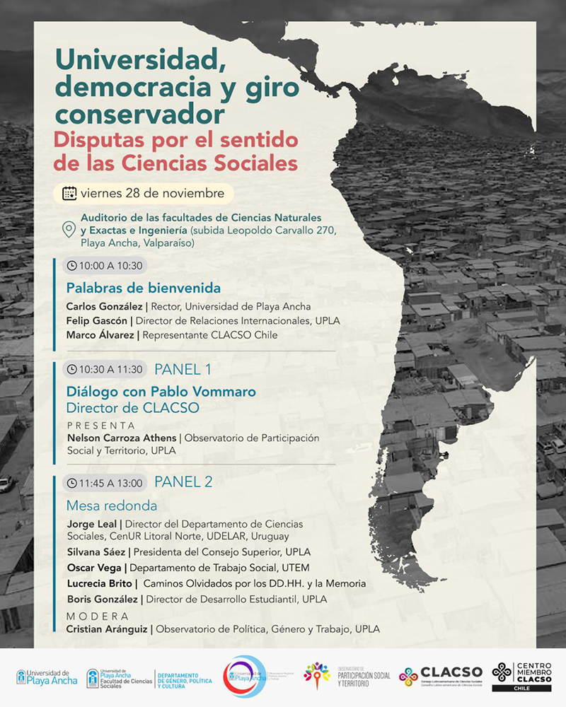 Del miércoles 26 al viernes 28 de noviembre, CLACSO participa de dos seminarios internacionales en Chile: “Inteligencia Territorial y Justicia Espacial” en la capital, Santiago, y “Universidad, democracia y giro conservador. Disputas por el sentido de las Ciencias Sociales” en Valparaíso.