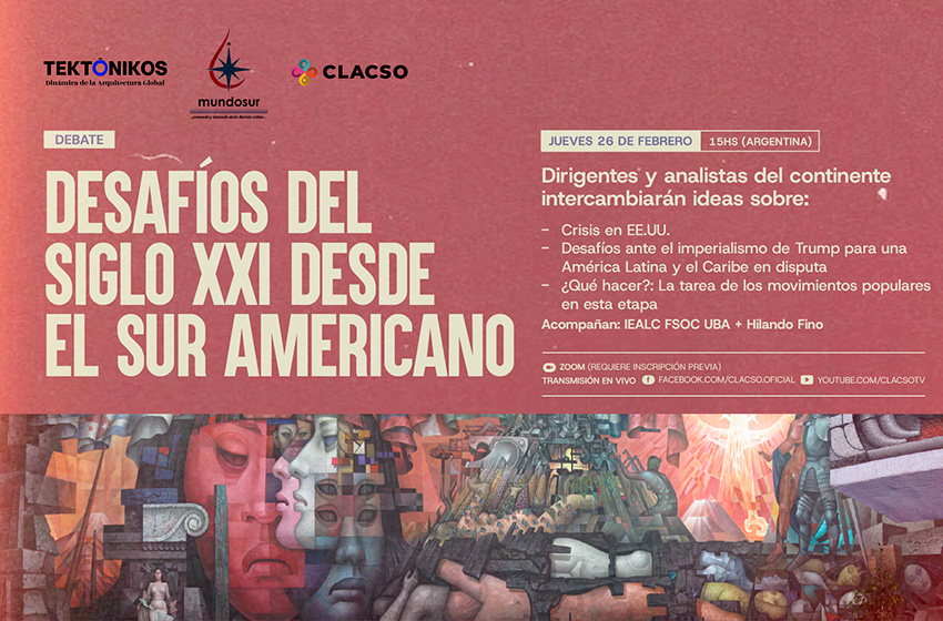 El jueves 26 de febrero a las 15:00 hora de Argentina (UTC-3), Tektónikos, en su segundo cumpleaños, junto a CLACSO y Mundo Sur, convocan a referentes políticos y académicos de América Latina y el Caribe a un encuentro virtual para debatir el escenario internacional y los desafíos de nuestra región.