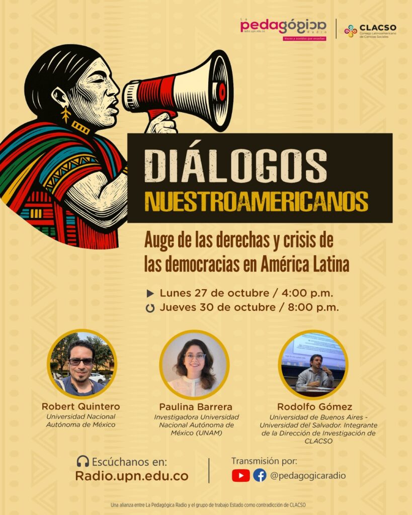 Diálogos Nuestroamericanos es el nuevo espacio de La Pedagógica Radio en asocio con el Grupo de Trabajo CLACSO “El Estado como contradicción”, el cual reúne investigadores, investigadoras, académicos y académicas de distintos países de América Latina para darle vida a la reflexión y el análisis de la coyuntura y los factores estructurales de la realidad sociopolítica de la región.