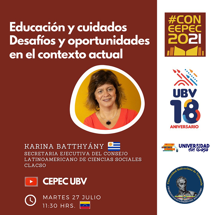 Karina Batthyány, Secretaria Ejecutiva del Consejo Latinoamericano de Ciencias Sociales (CLACSO), expuso el martes 27 de julio acerca de “Educación y cuidados. Desafíos y oportunidades en el contexto actual”, en el marco de la IIIª Convención de Estudios en Educación Emancipadora y Pedagogía Crítica (CONEEPEC 2021)