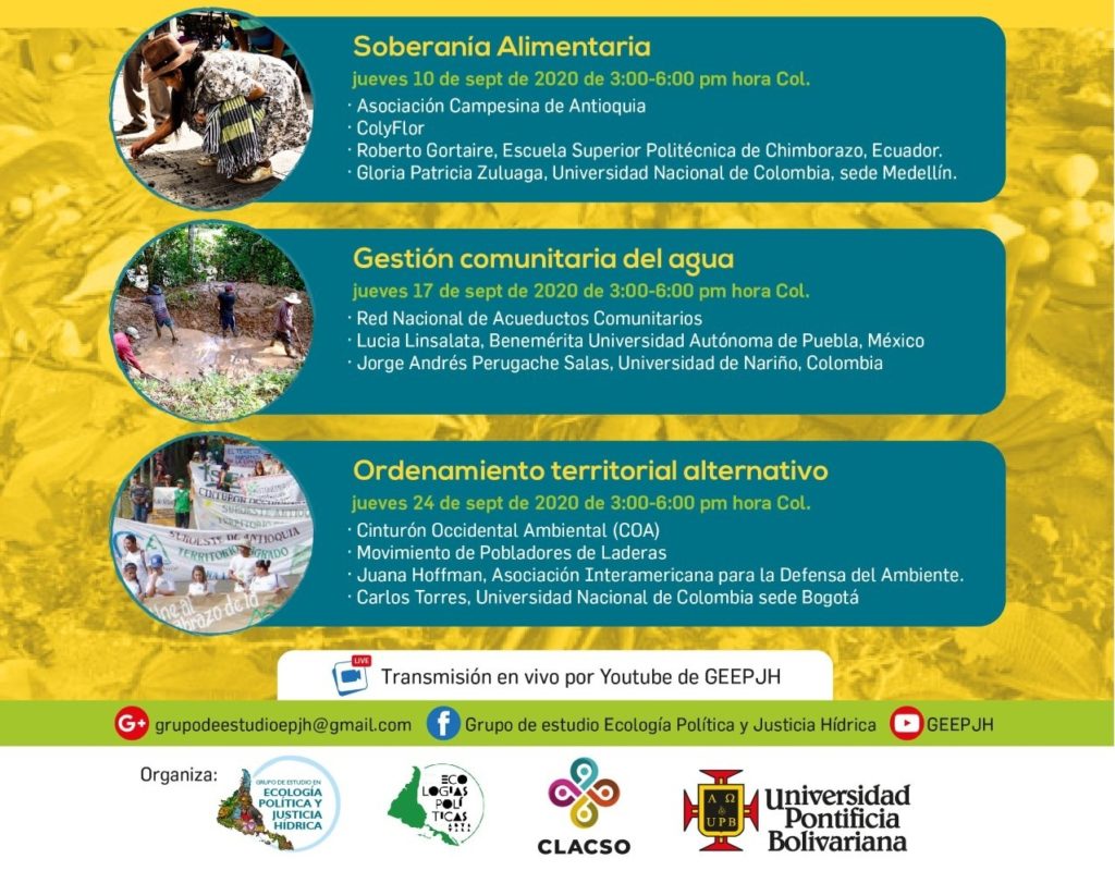 Los invitamos a los «Encuentros de Saberes: Alternativas desde los movimientos ecoterritoriales en Colombia frente a la crisis» organizados por el Grupo de Estudio de Ecología Política y Justicia Hídrica GEEPJH de Medellín, Colombia y el Grupo de Trabajo CLACSO Ecologia(s) Política(s) desde el Sur/Abya-Yala. La transmisión será en vivo por canal youtube GEEPJH y la grabación también estará disponible en la página de CLACSO TV en Youtube.