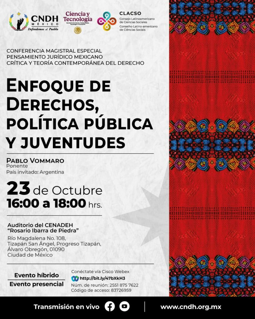 El jueves 23, organizado por la Comisión Nacional de los Derechos Humanos de México, la Secretaría de Ciencia, Humanidades, Tecnología e Innovación de México y el Consejo Latinoamericano de Ciencias Sociales, Pablo Vommaro, Director Ejecutivo de CLACSO, expuso acerca del “Enfoque de Derechos, política pública y juventudes” en el marco de la Conferencia Magistral Especial Pensamiento Jurídico Mexicano: Crítica y teoría contemporánea del derecho.