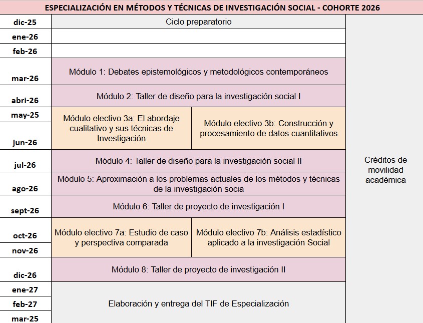La Especialización en Métodos y técnicas de investigación social tiene una duración de 12 meses y requiere para su acreditación la aprobación de: