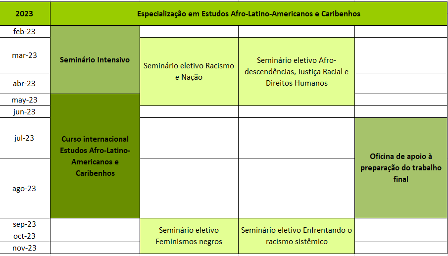 A Especialização em Estudos Afro-Latino-Americanos e Caribenhos terá duração de 12 meses e exige a realização de:
