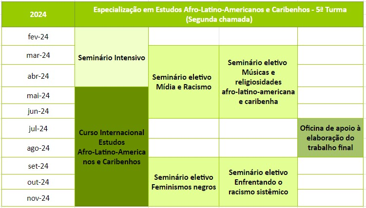 A Especialização em Estudos Afro-Latino-Americanos e Caribenhos terá duração de 12 meses e exige a realização de: