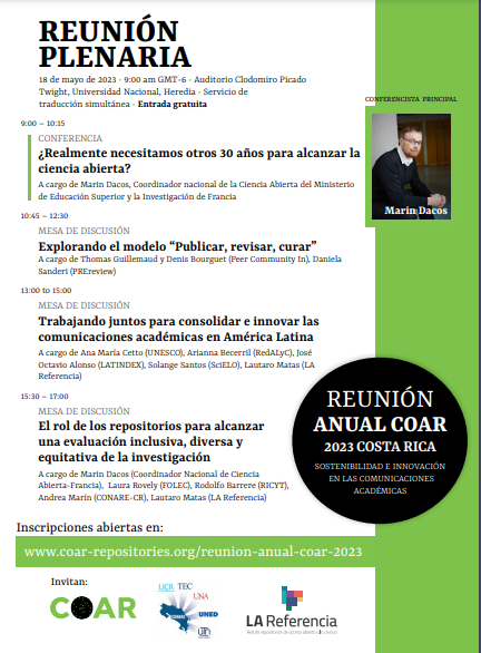 La Reunión Anual del COAR 2023 tendrá lugar en San José, Costa Rica, del 16 al 18 de mayo de 2023. El Consejo Nacional de Rectores (CONARE) y la Universidad Nacional de Costa Rica serán los anfitriones de la reunión, organizada conjuntamente por el CONARE, el COAR y LA Referencia.