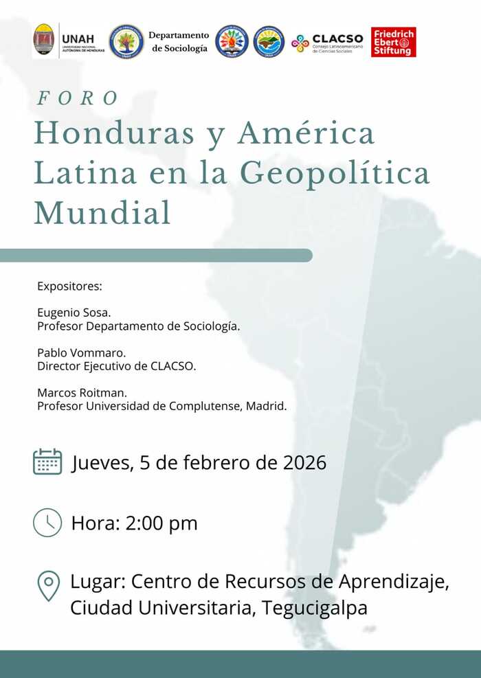 El jueves 5 de febrero, el Centro de Recursos de Aprendizaje de Ciudad Universitaria, en Tegucigalpa, Honduras, es la sede del foro “Honduras y América Latina en la Geopolítica Mundial” que propone un espacio de análisis y debate sobre el lugar de la región en el escenario geopolítico contemporáneo, atendiendo a los desafíos, tensiones y reconfiguraciones del orden mundial actual.
