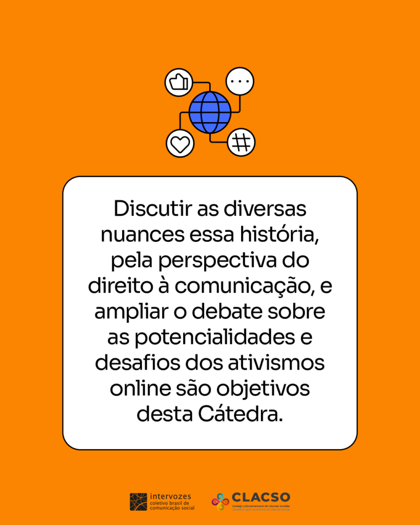 A Cátedra Direito à Comunicação e ativismos online tem comoobjetivo principal discutir aspectos teóricos e intercambiarconhecimentos práticos sobre as possibilidades da atuação demovimentos sociais no espaço público digital. São também objetivosespecíficos da Cátedra: a) refletir sobre a relação entre Direito àComunicação, liberdade de expressão e democracia; b) ampliar o debate sobre o funcionamento da internet, sobretudo nos seusaspectos sociotécnicos, políticos e econômicos; c) fornecercontribuições para a qualificação da presença crítica de movimentossociais em diferentes plataformas e redes digitais.