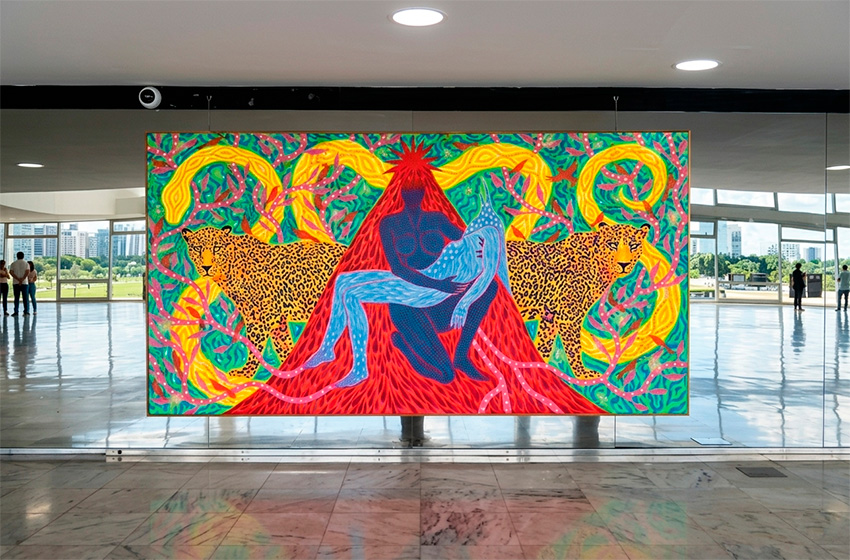 Daiara Tukano, activista y comunicadora del pueblo Yepá Mahsã, es la autora del mural “La caída del cielo y la madre de todas las luchas”. Se trata de la primera obra de un artista indígena brasileña en el Salón Noble del Palacio del Planalto en Brasilia. Su presencia en el Palacio del Planalto está directamente vinculada con la reconstrucción simbólica y física del edificio tras los ataques de bolsonaristas el 8 de enero de 2023. Durante el asalto a las sedes de los tres poderes, numerosos objetos de valor histórico y artístico fueron vandalizados o destruidos. La adquisición y colocación de la obra de Daiara Tukano formó parte de un esfuerzo por renovar el acervo del Palacio con piezas que reflejaran la diversidad cultural de Brasil.
