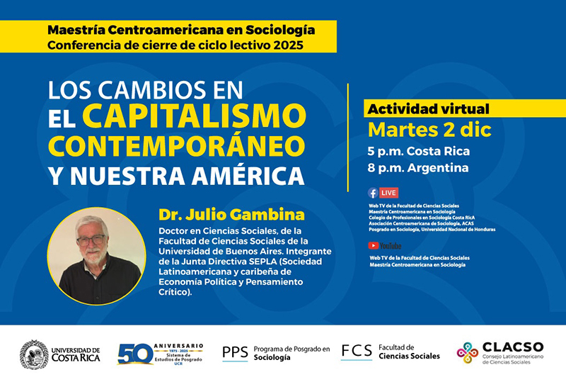 La Maestría Centroamericana en Sociología de la Universidad de Costa Rica invitó el martes 2 de diciembre a la Conferencia de cierre de ciclo lectivo 2025, a cargo de Julio Gambina, Doctor en Ciencias Sociales por la Facultad de Ciencias Sociales de la Universidad de Buenos Aires, Argentina, e integrante de la Junta Directiva SEPLA (Sociedad Latinoamericana y Caribeña de Economía Política y Pensamiento Crítico).
