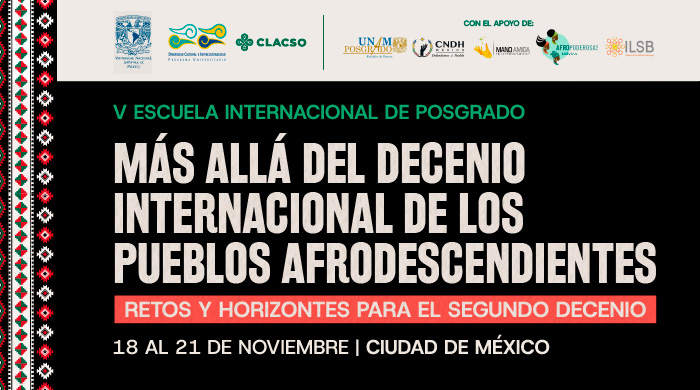 En Ciudad de México, del 18 al 21 de noviembre, se desarrolló la V Escuela Internacional de Posgrado “Más allá del decenio internacional de los pueblos afrodescendientes. Retos y horizontes para el segundo decenio”, organizado por el Consejo Latinoamericano de Ciencias Sociales, el Grupo de Trabajo CLACSO “Afrodescendencias y propuestas contrahegemónicas” y el Programa Universitario de Estudios de la Diversidad Cultural y la Interculturalidad de la Universidad Nacional Autónoma de México.