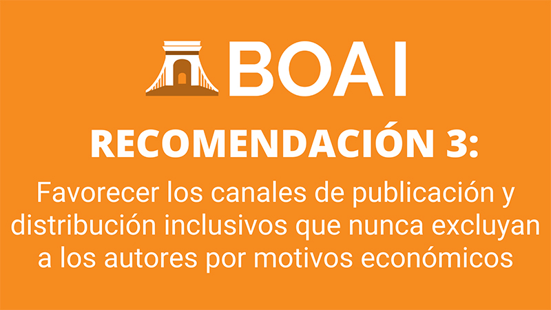 3. Favorecer los canales de publicación y distribución inclusivos que nunca excluyan a los autores por motivos económicos. Aprovechar al máximo los repositorios de acceso abierto y las revistas sin APC (acceso abierto «verde» y «diamante»). Alejarse de los cargos por procesamiento de artículos (APC).