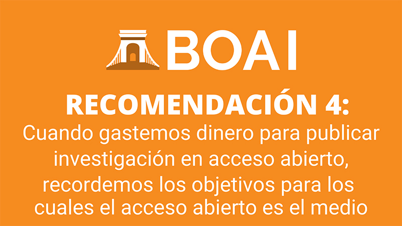 4. Cuando gastemos dinero para publicar investigación en acceso abierto, recordemos los objetivos para los que el acceso abierto es el medio. Favorecer los modelos que benefician a todas las regiones del mundo, que son controlados por organizaciones académicas y sin ánimo de lucro, que evitan concentrar la nueva literatura de acceso abierto en las revistas comercialmente dominantes, y que evitan afianzar los modelos en conflicto con estos objetivos. Alejarse de los acuerdos de lectura y publicación (read-and-publish agreements).