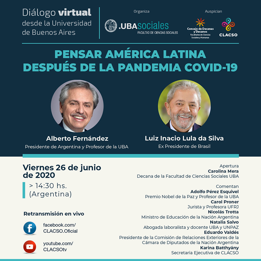 La Facultad de Ciencias Sociales de la Universidad de Buenos Aires organizó el diálogo virtual “Pensar América Latina después de la pandemia” el viernes 26 de junio, con la participación del Presidente de la República Argentina, Alberto Fernández, y del ex mandatario brasileño Luiz Inacio Lula da Silva.
