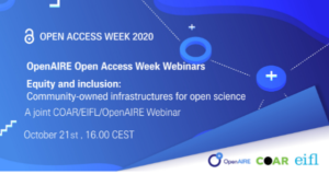 VIDEO: https://www.youtube.com/watch?v=OJifBtuBlRM Organizan: Confederation of Open Access Repositories (COAR), European Open Access Infrastructure (OpenAIRE) y Electronic Information for Libraries (EIFL) o Webinar “Equity and inclusion: community-owned…