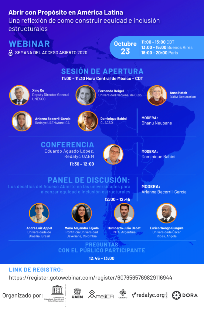 Organizan: UNESCO, UAEM, Redalyc, CLACSO, AmeliCA, DORA